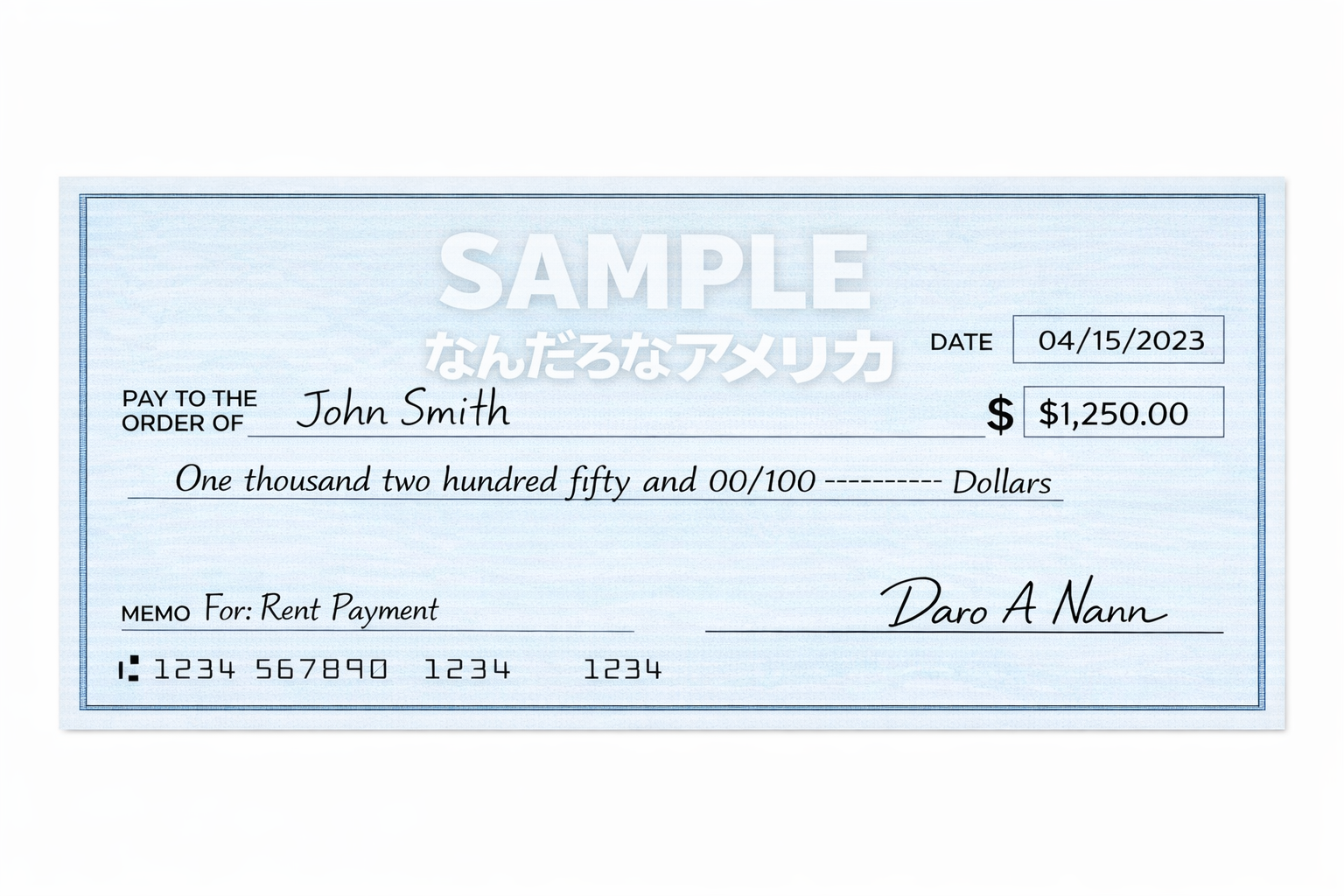 なん A 太郎さんが John Smithさんに$1250払うときの例です。だいたい雛形は決まっています。