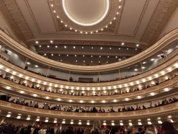 カーネギー・ホールの最大の特徴は、その「音響の美しさ」と「建築的な優雅さ」です。スターン・オーディトリアム(旧メインホール)は2800席を有し、馬蹄形のバルコニーが幾重にも連なる構造。どの座席に座っても、澄み切った音の響きが感じられる理想的な設計です。内装はクリーム色と金色を基調にした荘厳な装飾が施され、天井のアーチや柱、豪奢なシャンデリアがクラシックな雰囲気を醸し出します。