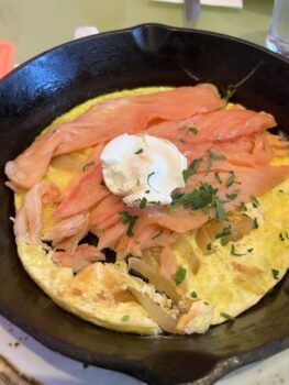 付け合わせにはトースト、ホームフライ(さいの目ポテト炒め)、ベーコンやソーセージ。オムレツ一皿で栄養バランスもボリュームも満点。
